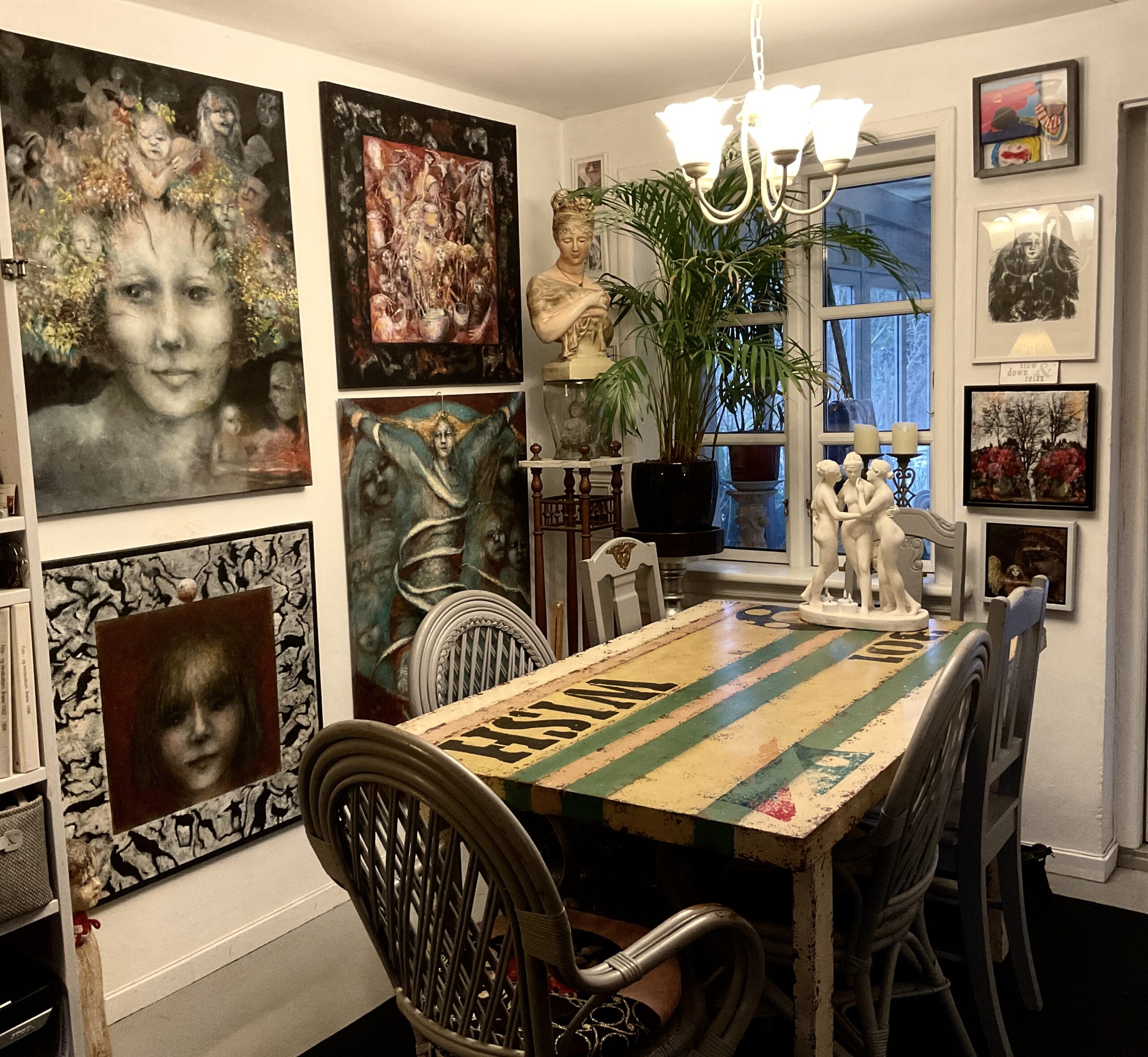 Adskillige censurerede udstillinger, herunder KE. Jeg udstiller ikke mindst olie malerier, men også en del raderinger og værker af akryl og kul. De senere år er der kommet æbler på en del af mine malerier, men også som tidligere ansigter, stole, krukker, særlige blomster og borde. Jeg holder af at fortælle historier uden ord, hvor mine værker gerne skulle udtrykke en stemning af at et eller andet uvist, lidt umuligt og eventyrligt er på færde.