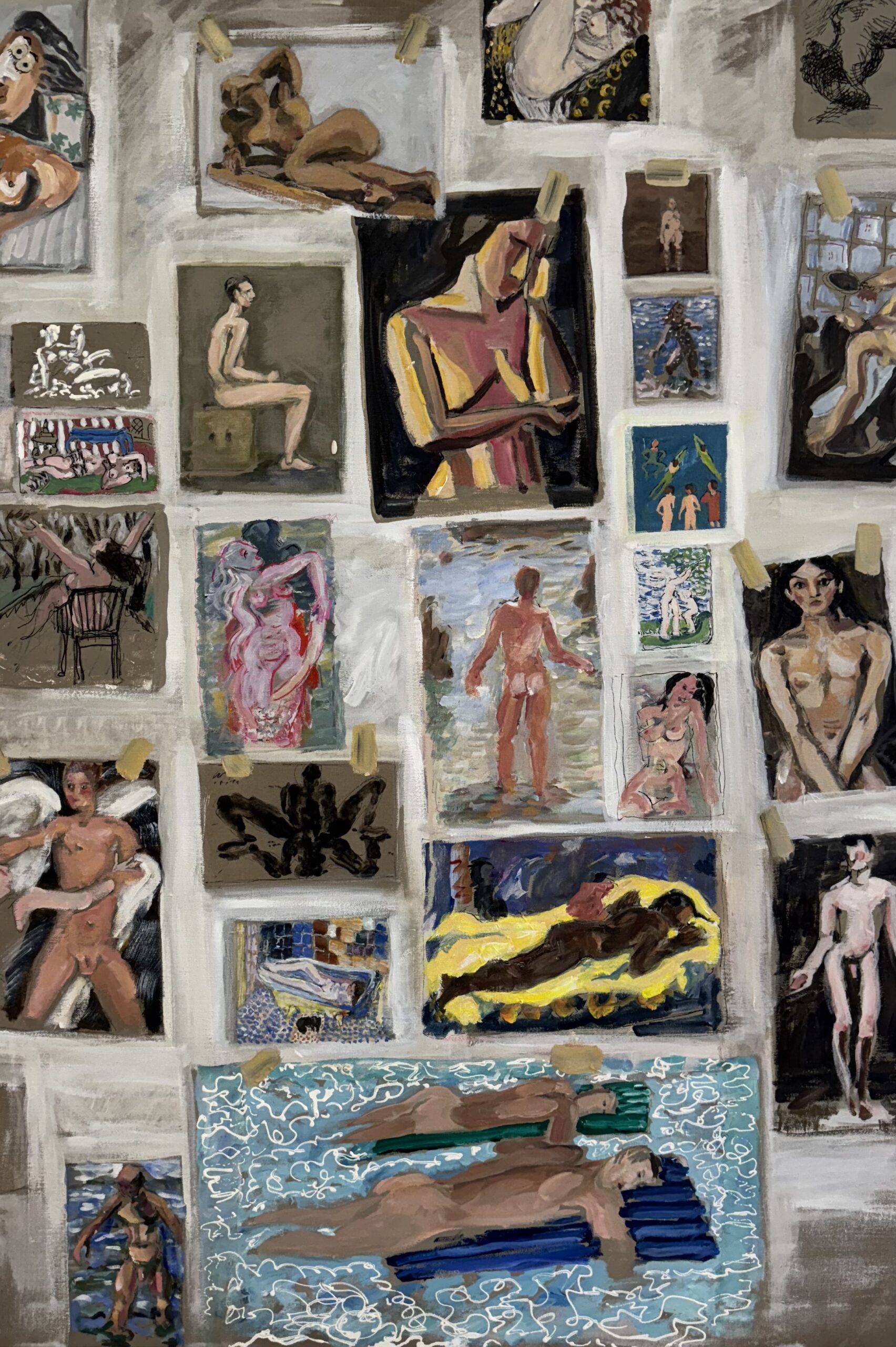 Mit igangværende arbejde handler om en serie, jeg kalder “Hang Out”. Malerierne kommer af en proces, jeg kalder kalejdoskopiske refleksioner.