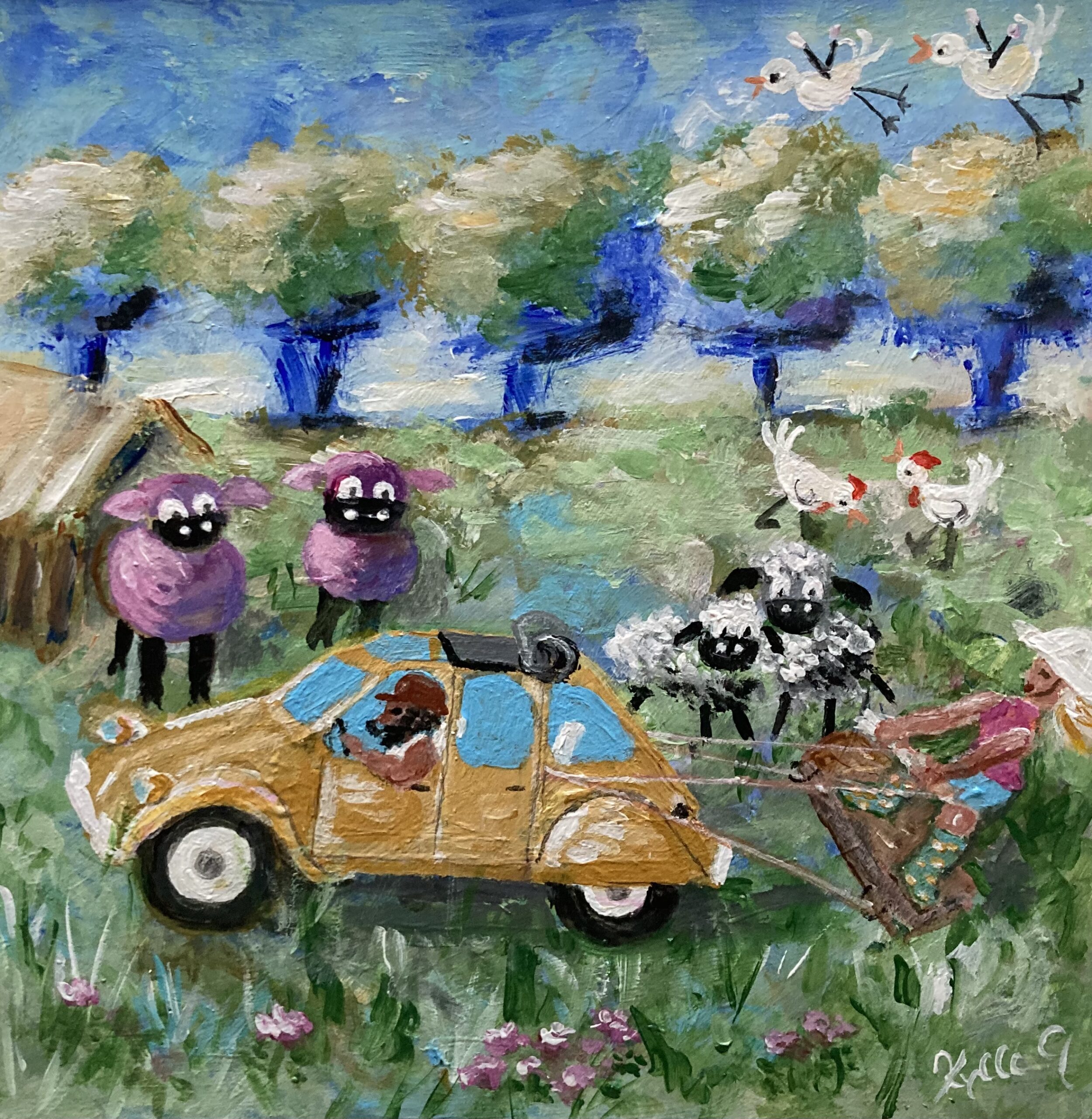 Jeg udstiller egne akrylmalerier: Naivistiske-, græsk inspirerede- og fabulerende landskaber. Jeg er en romantisk sjæl. Det smukke, ægte og uspolerede, – tænder og inspirerer mig.